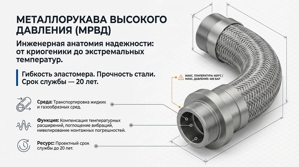 Металлорукав высокого давления из нержавеющей стали представляет собой герметичный гибкий трубопровод, предназначенный для транспортировки жидких и газообразных сред под давлением. В отличие от полимерных аналогов, данные изделия сохраняют структурную целостность в экстремальном диапазоне температур от -270 °C до +600 °C. Основная функция МРВД заключается не только в передаче среды, но и в компенсации температурных расширений, поглощении вибраций и нивелировании монтажных погрешностей жестких трубопроводов. Инженерная ценность этих компонентов обусловлена сочетанием высокой механической прочности стали и эластичности гофрированной структуры.